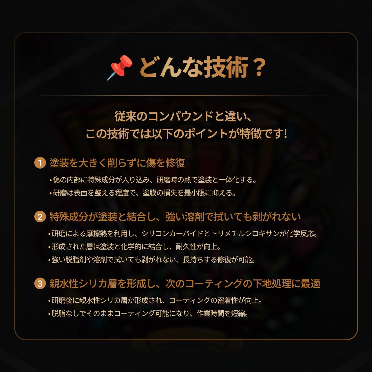 1.	特許取得の特殊成分が研磨熱と反応し、傷を修復しながら塗装と一体化