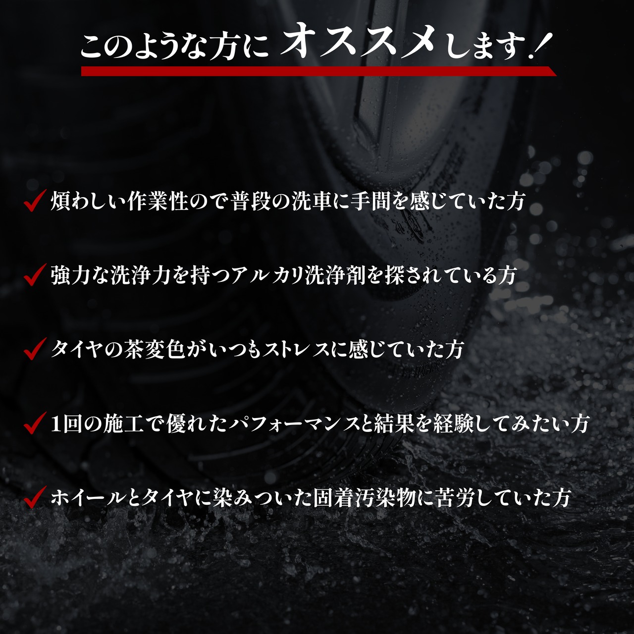 アルカリ性洗剤は油汚れ等に非常に効果的でタイヤやホイールの洗浄に特に高い効果を発揮します。