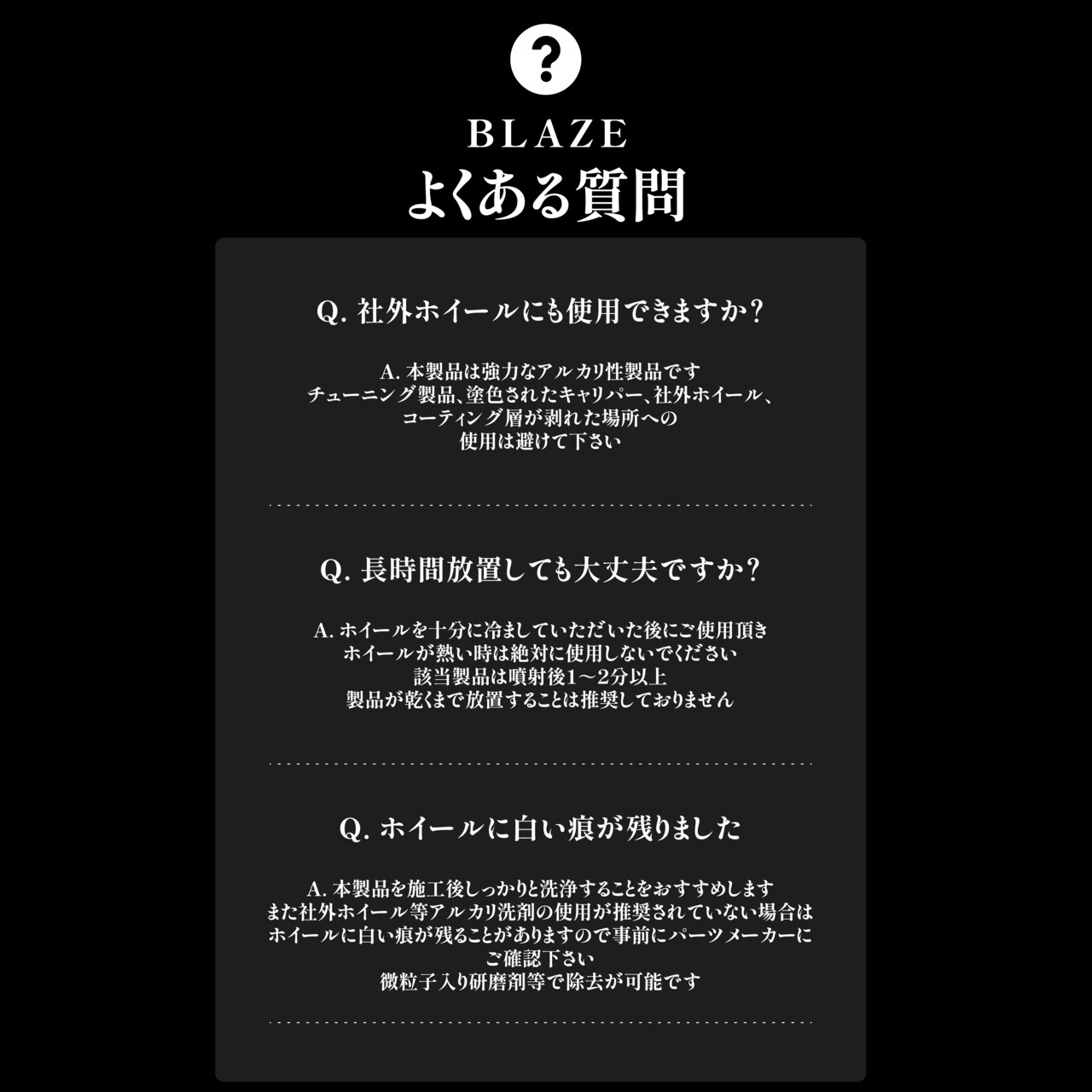 ・メッキやアルマイトなどアルカリ系洗剤が使用出来ないパーツにはご使用頂けません。ご使用前には必ず目立たない所でテストしてからご使用下さい。