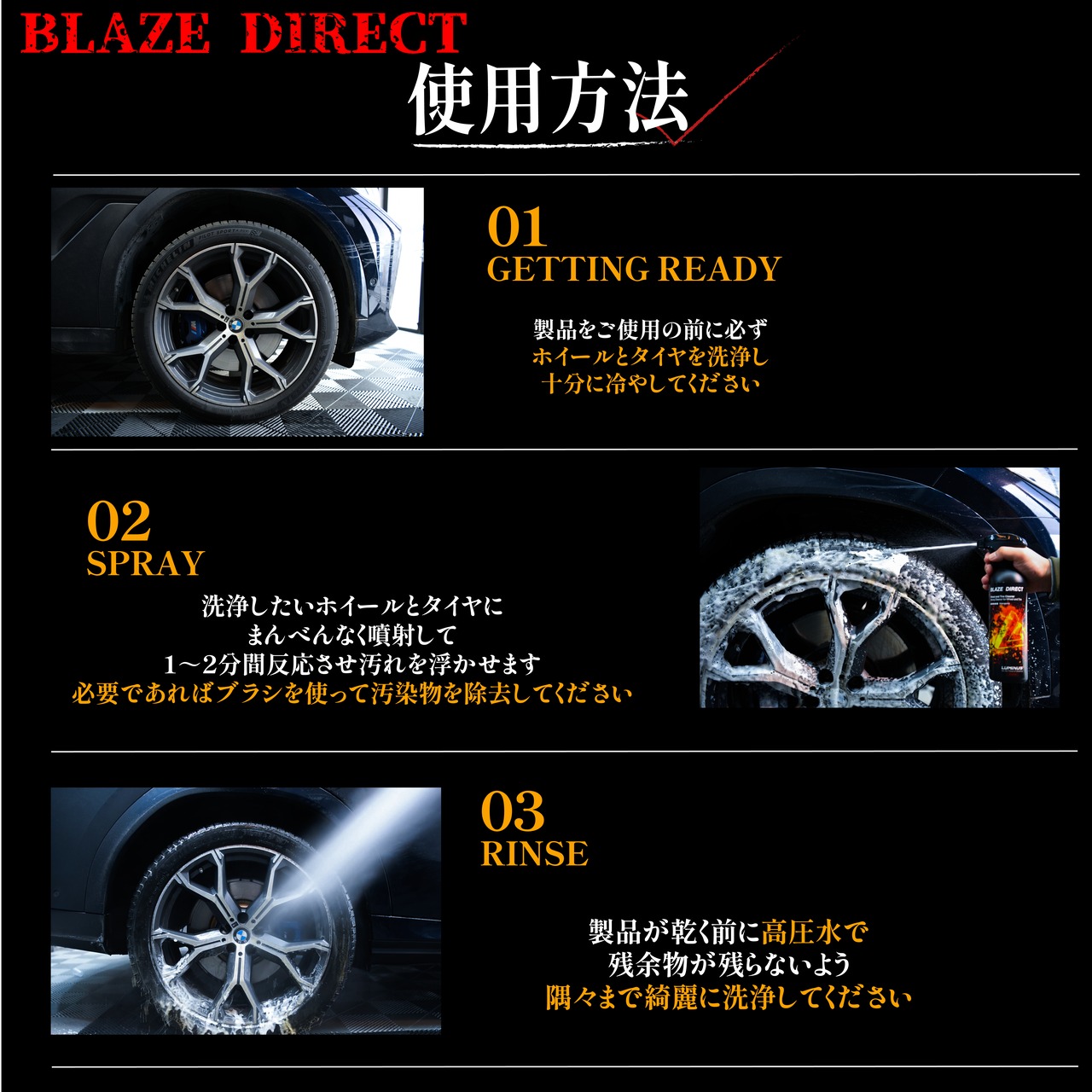 ・タイヤ&ホイールを流水でよく洗い流します。温度が高い場合はこの時点でよく冷まして下さい。