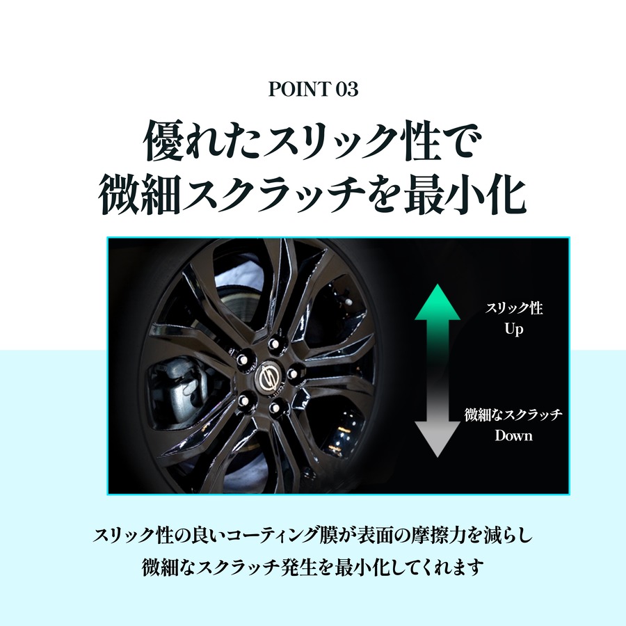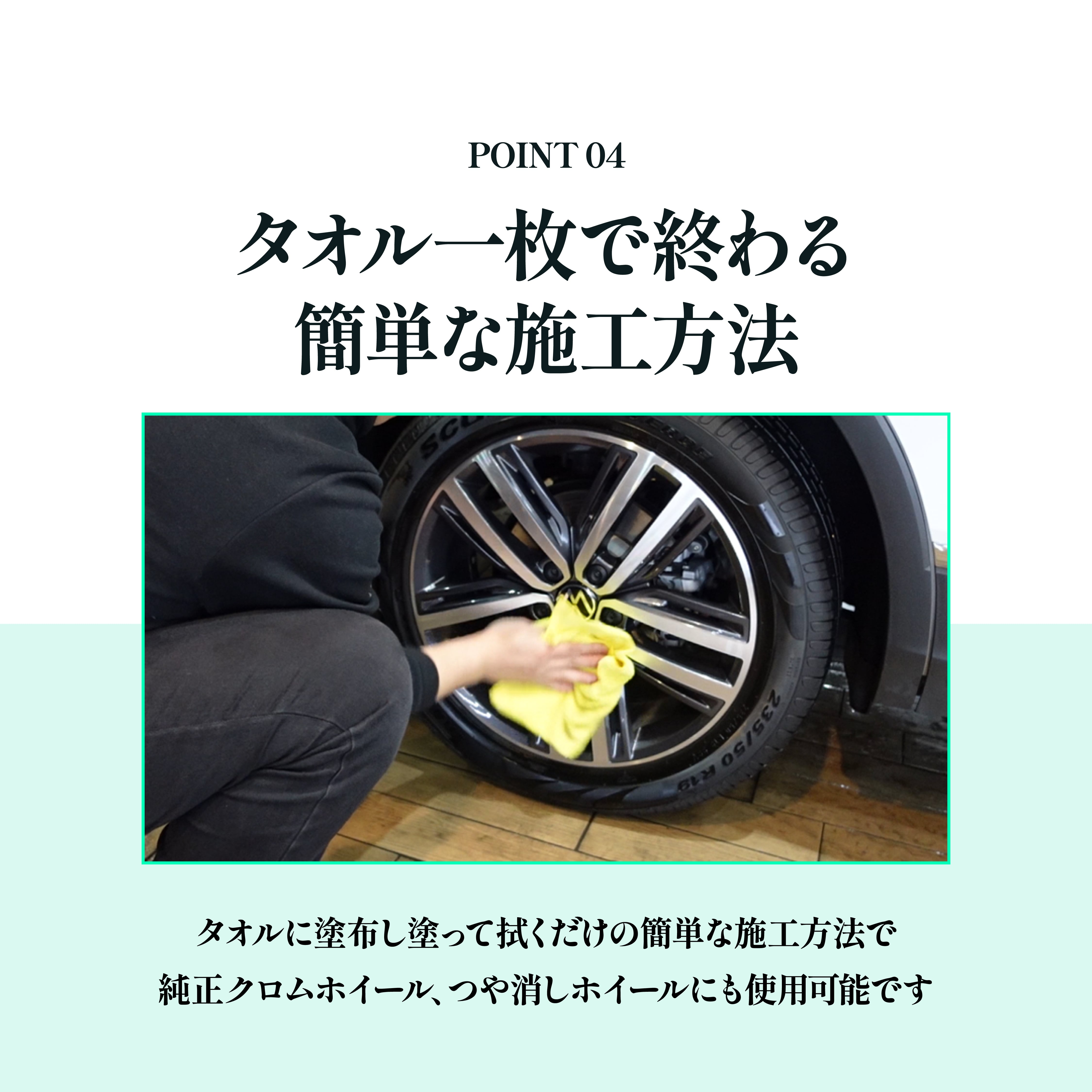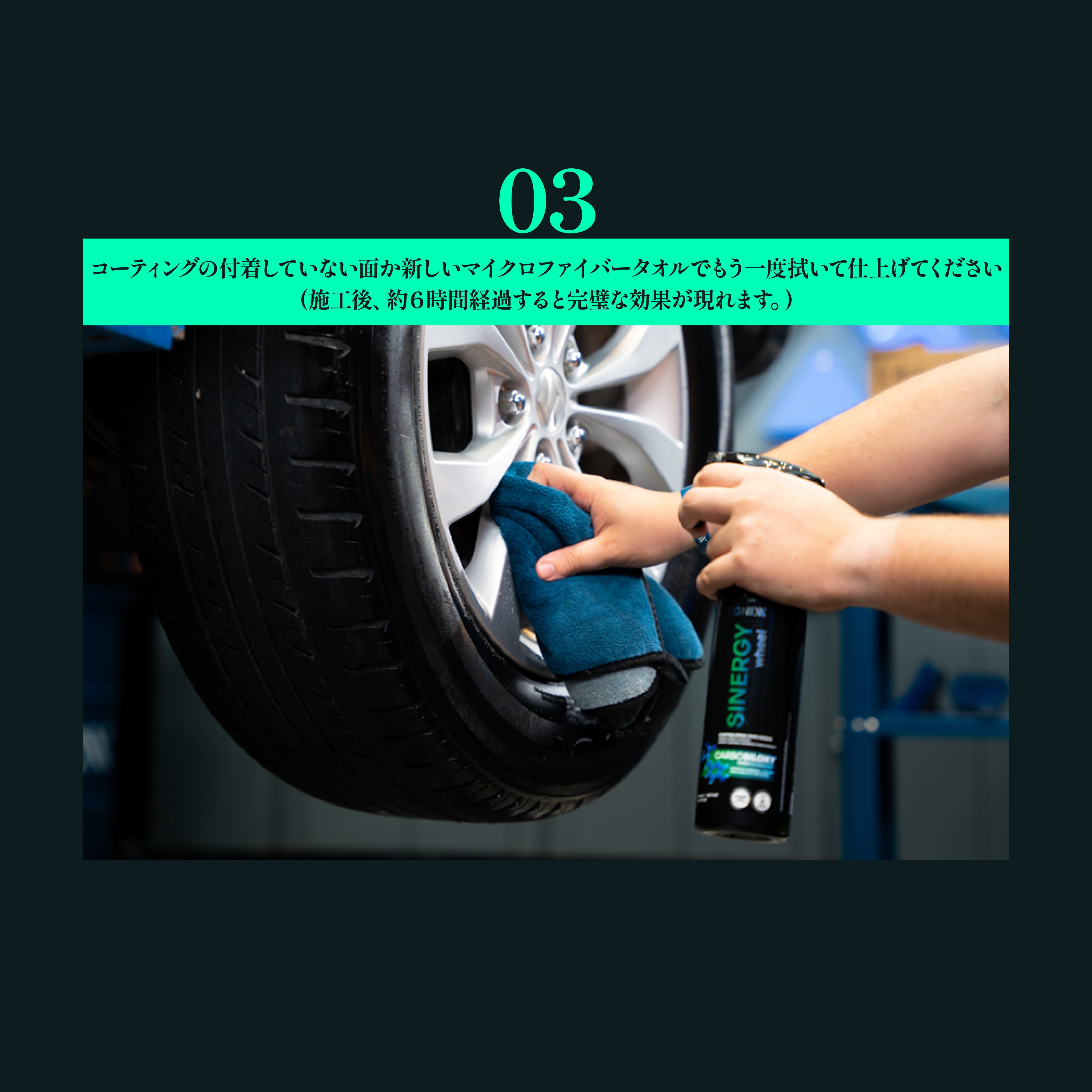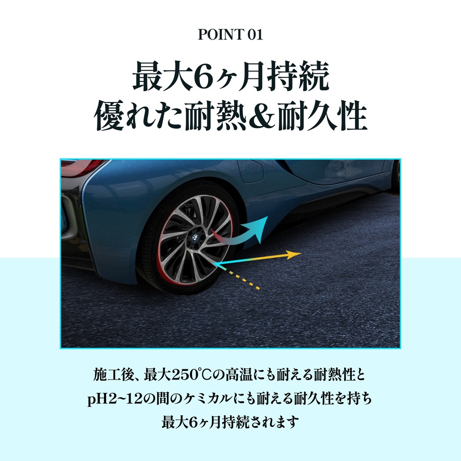 さらに、このスプレーコーティングは、ホイールの水滴を弾き、ウォータースポットの発生を抑え、耐摩耗性も備えています。また、既存のセラミックコーティングのメンテナンス製品としても適しており、ホイールを簡単に清潔に保てます。シンプルにスプレーして拭き取るだけで、美しい光沢を復活させることができます。