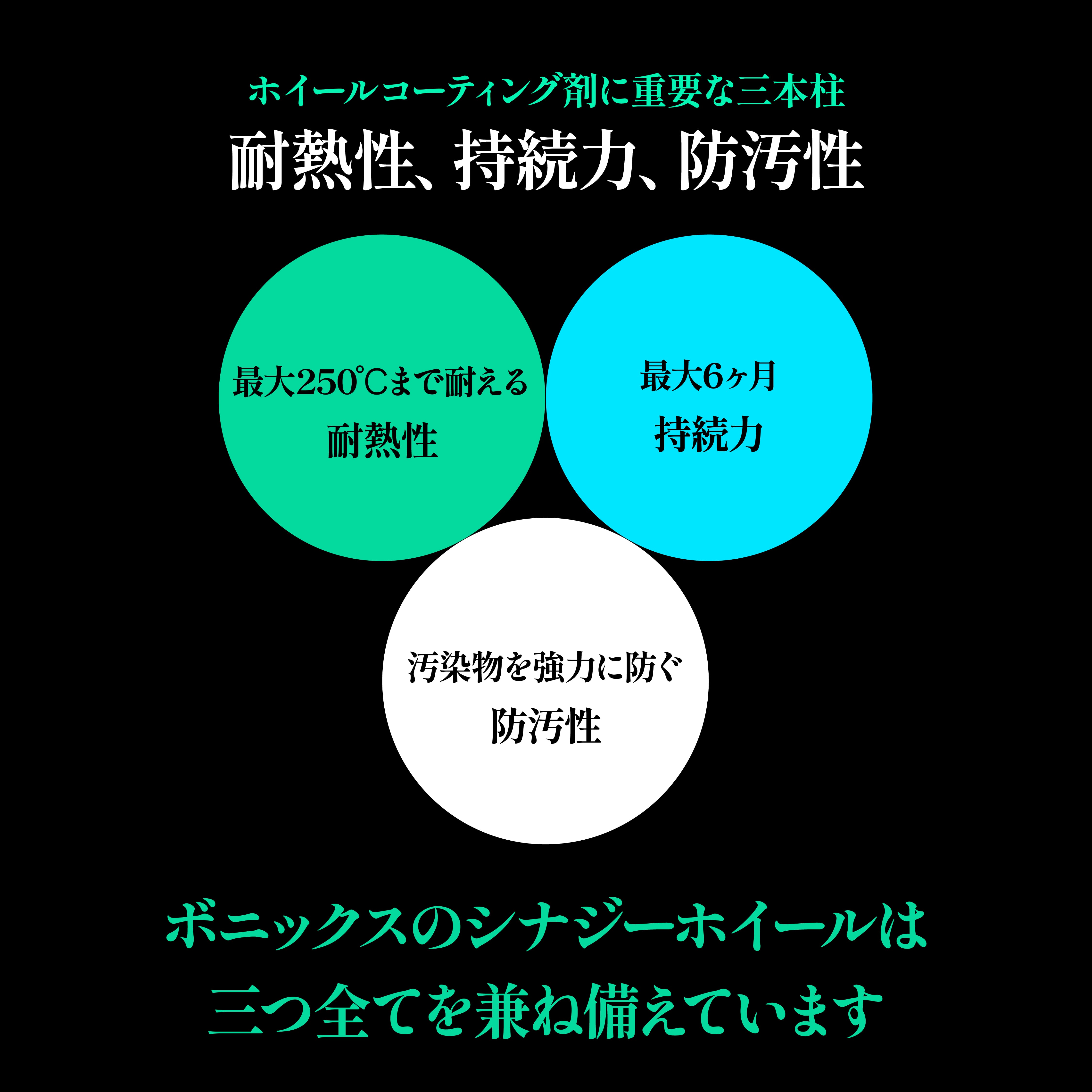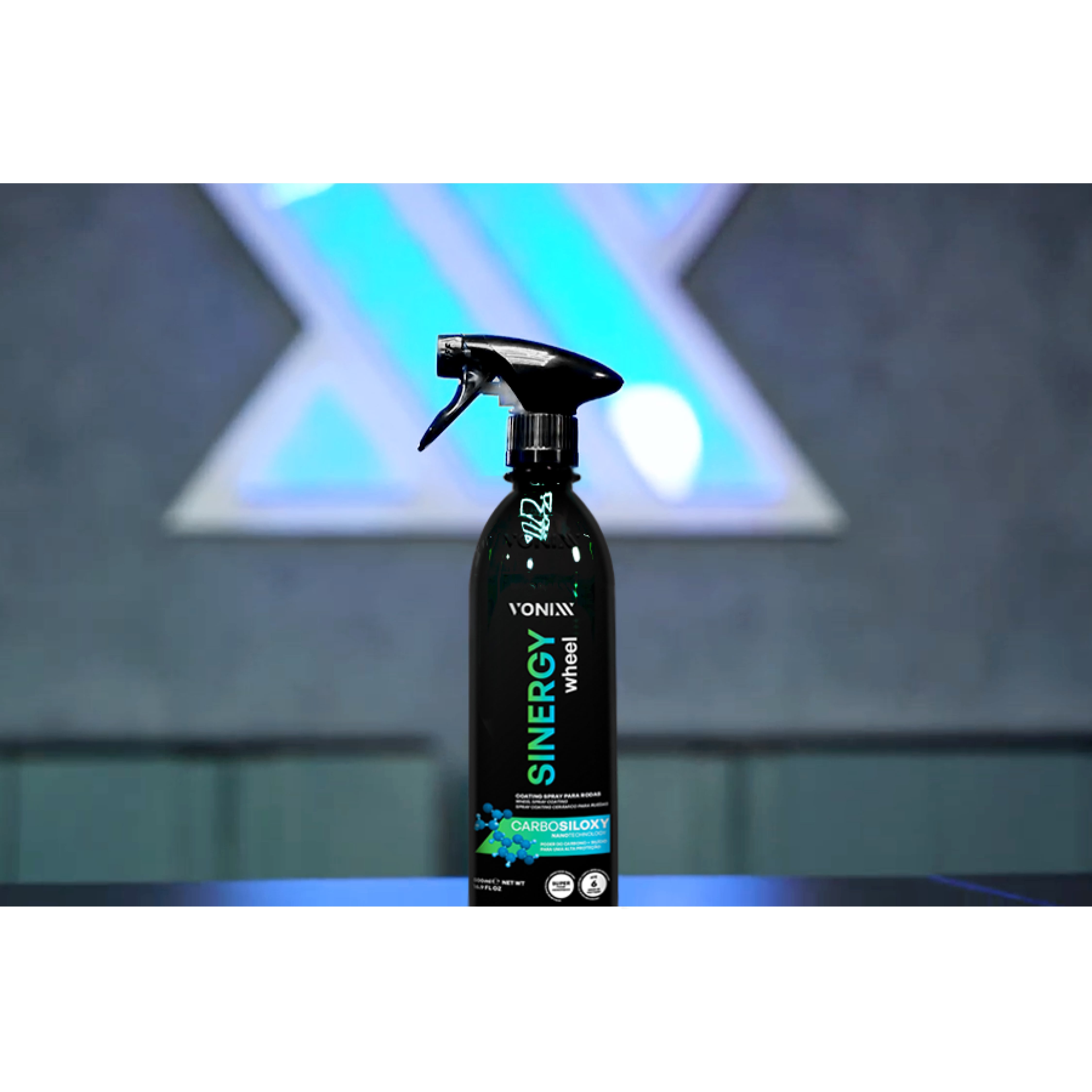 VONIXXの「シナジーホイール・スプレーコーティング」は、ホイールの美しさと耐久性を強化するために開発されたセラミックスプレーです。ブラジル独自のCARBOSILOXYテクノロジーを使用し、カーボンとシリコンの相互作用によって耐久性のある撥水膜を形成し、ホイールの防汚性を高めます。最大6か月の保護を提供し、ブレーキ熱にも耐えられるよう高温にも強く設計されています。