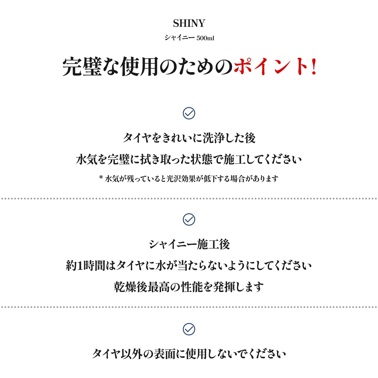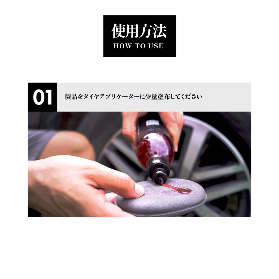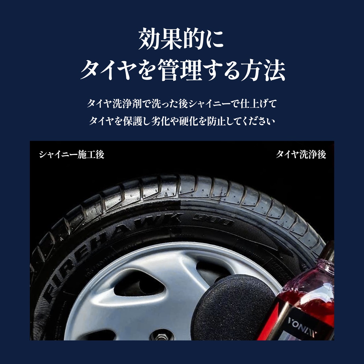 使用方法はシンプルで、タイヤをきれいにしてからフォームアプリケーターでShinyを均等に塗布するだけで、より深みのある仕上がりと持続力を発揮します。