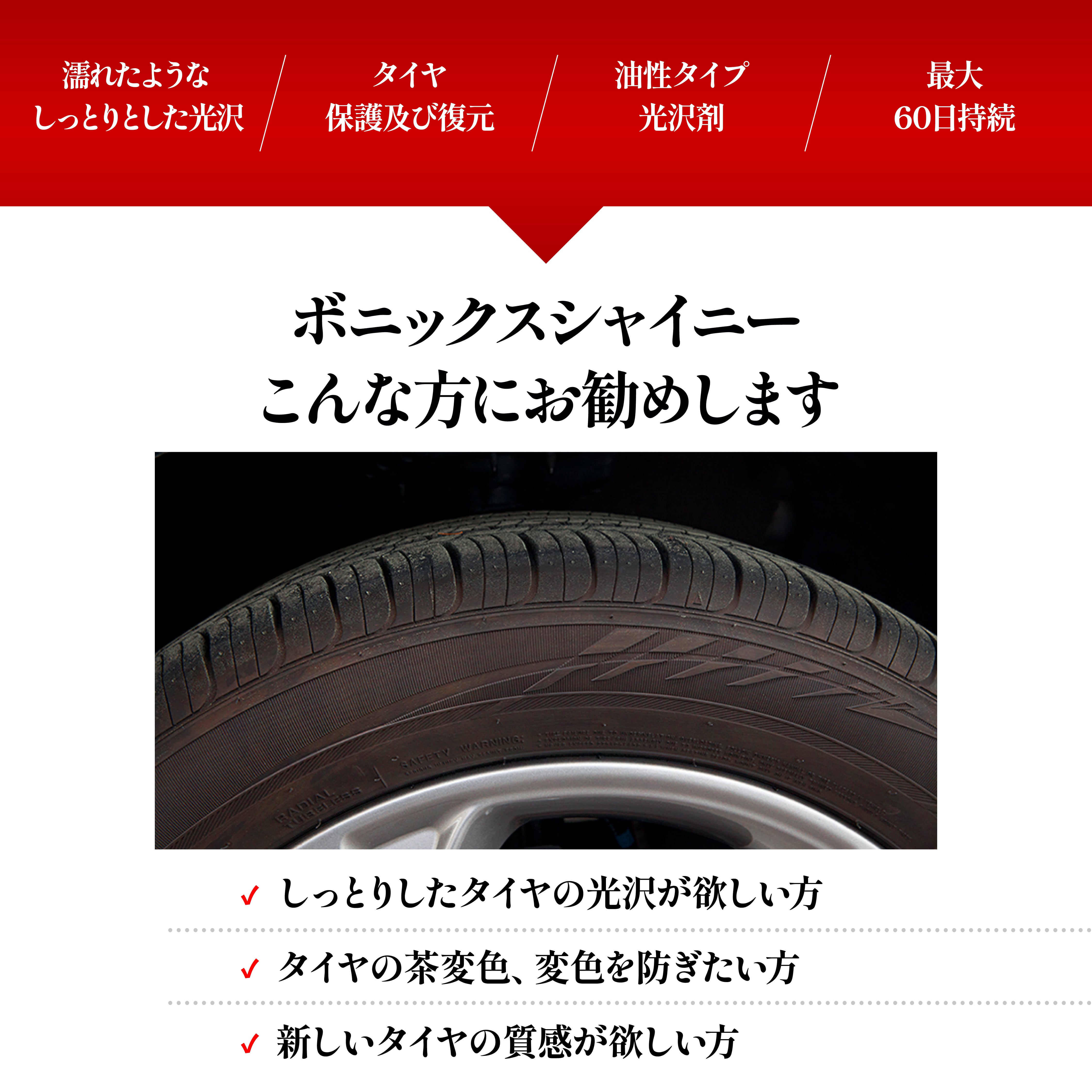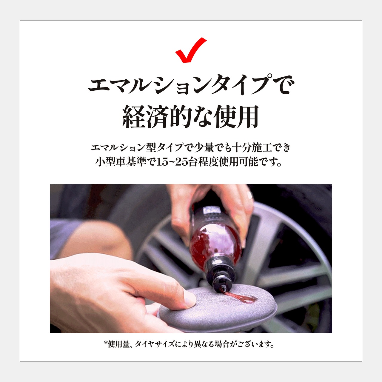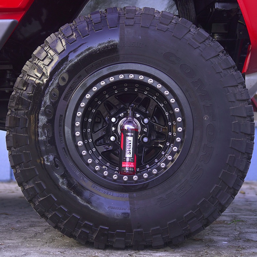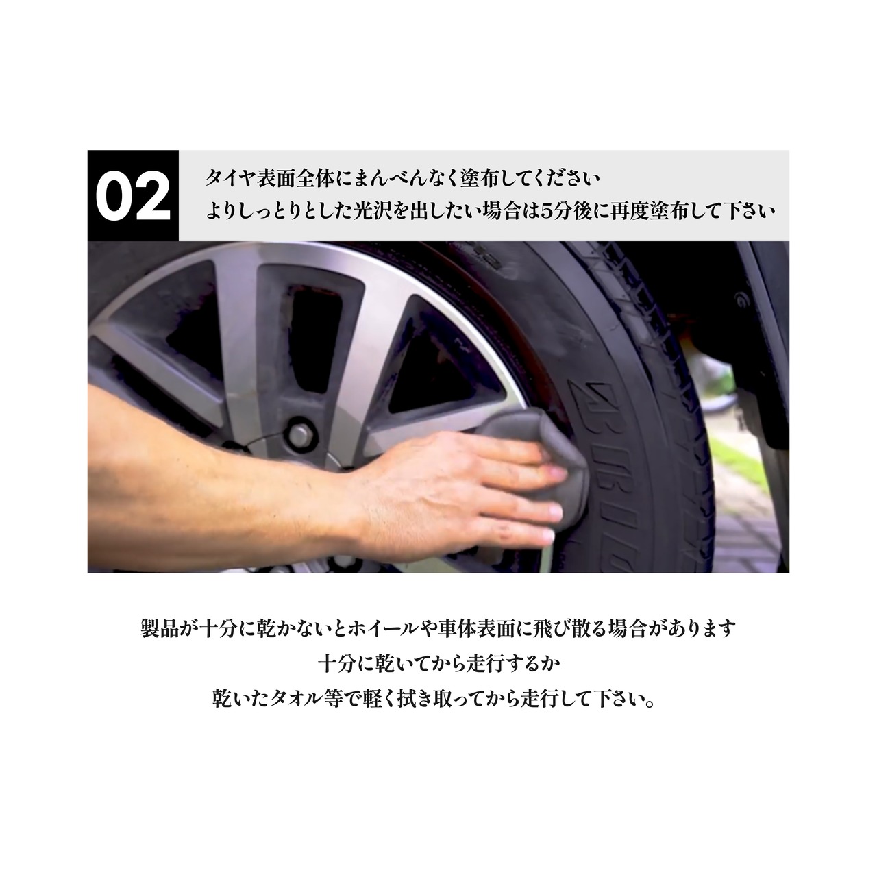 使用方法はシンプルで、タイヤをきれいにしてからフォームアプリケーターでShinyを均等に塗布するだけで、より深みのある仕上がりと持続力を発揮します。