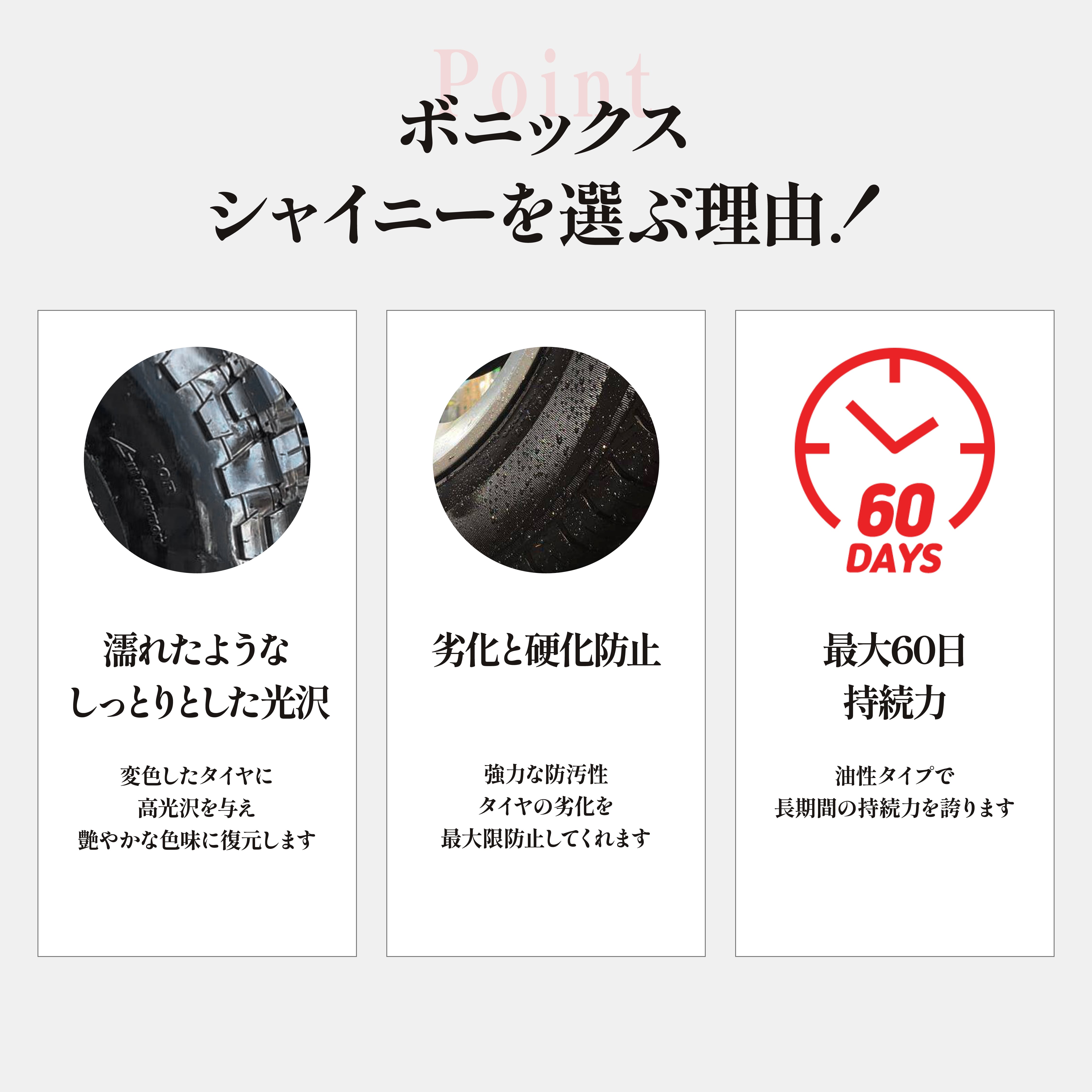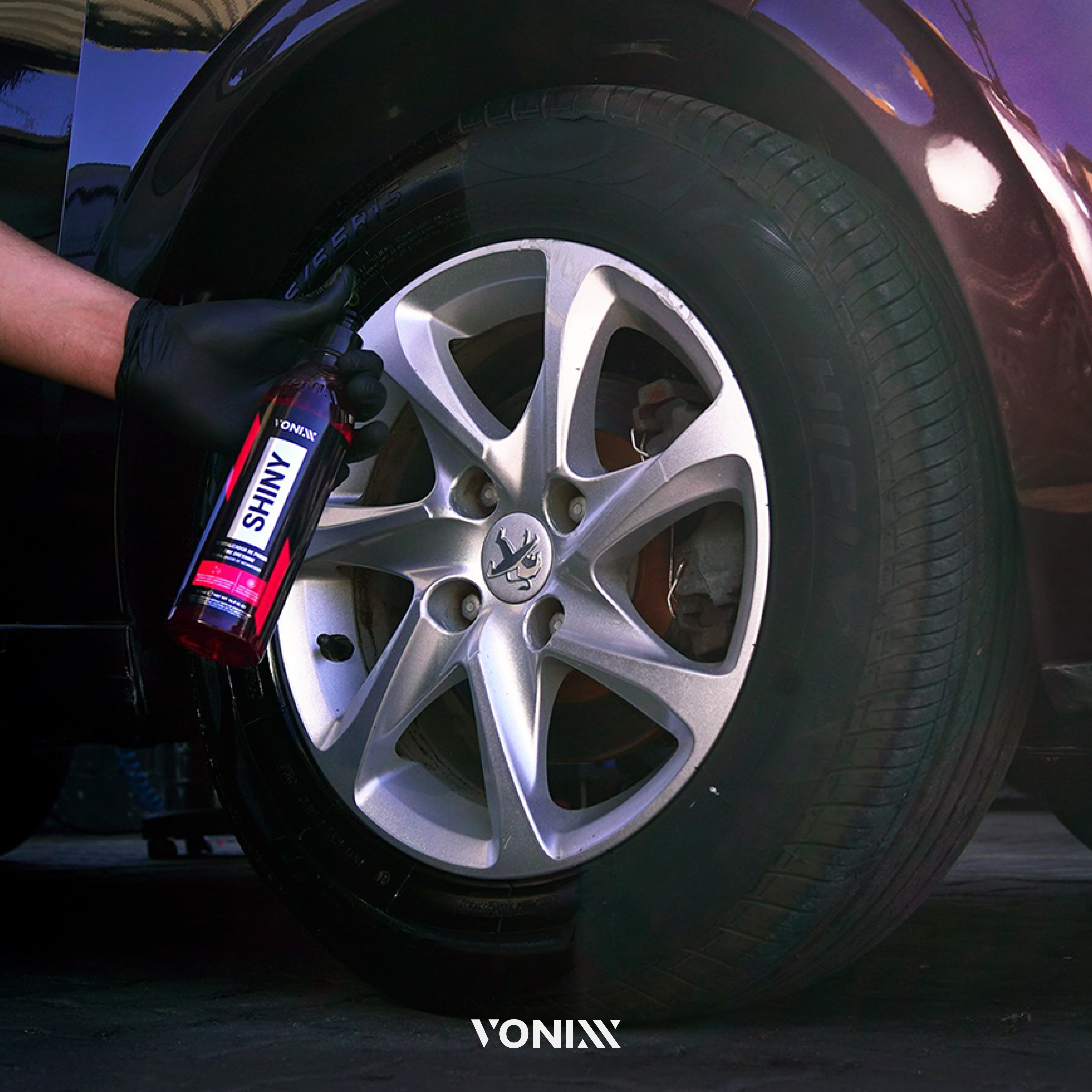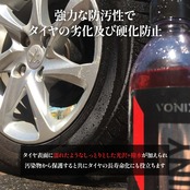 VONIXXの「Shiny」は、タイヤ専用に開発されたハイグロス仕上げのタイヤドレッシングで、鮮やかで長持ちする光沢を与えます。水に強く、耐久性が高いため、タイヤ表面の濡れたような輝きを最大で60日間持続させることができ、過酷な環境でも色落ちや劣化がありません。また、溶剤ベースでありながら、環境に配慮された設計で、タイヤの保護とコンディショニングを同時に行えます。
