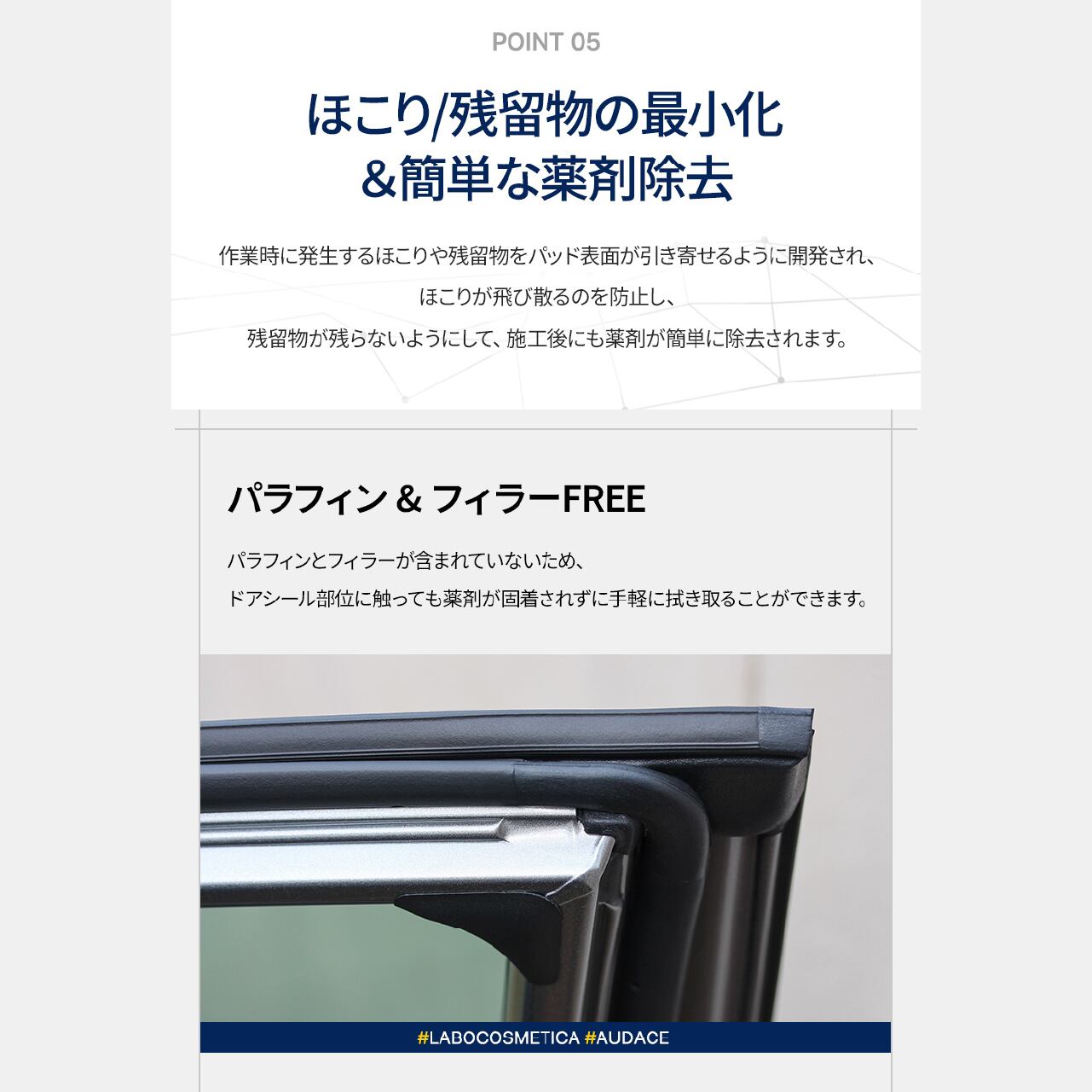 - **残留物なし**: トリムに汚れや残留物を残しません。