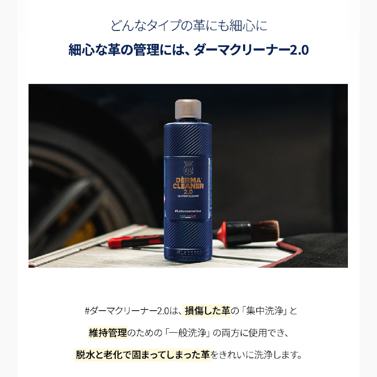 DÈRMA CLEANER 2.0は、レザーシートのオリジナルで自然な仕上がりを長期間維持するための理想的な製品です。非常に傷んだレザー張りに対して、特別な洗浄用の洗剤として使用できるだけでなく、メンテナンス製品としても活躍します。特別なエモリエント剤(保湿成分)を含む独自のミセル機能を備えたフォーミュラにより、皮革表面を潤しながら洗浄し、早期の老化を防ぎ、レザーのオリジナルの仕上がりを保ちます。また、清潔感のある爽やかな香りを残し、閉ざされた空間やカビ臭などの不快な臭いを中和します。
