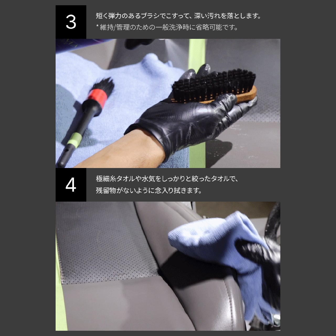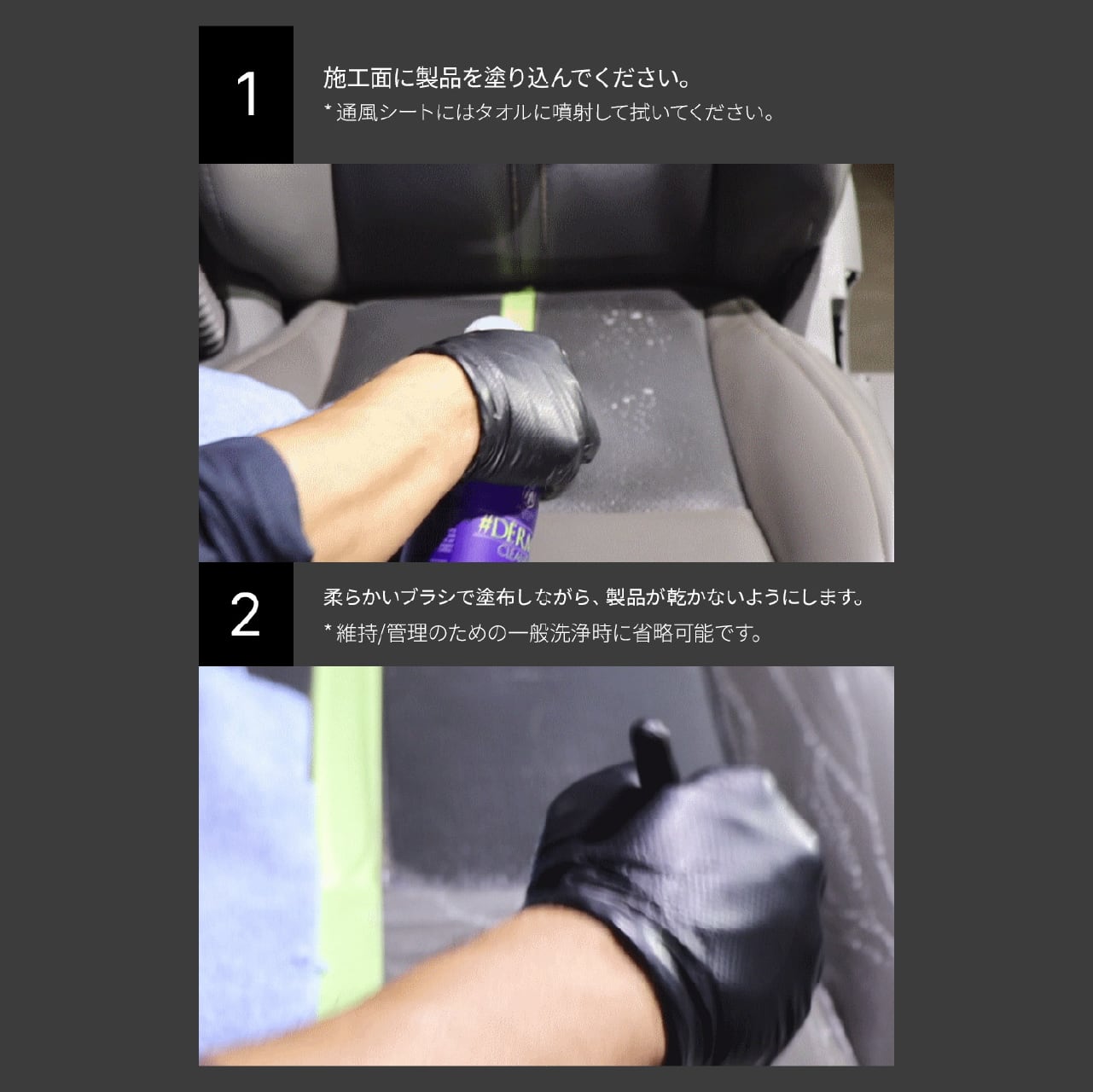 まず、掃除機を使ってホコリや大きな汚れを取り除きます。製品を直接表面または柔らかいブラシに噴霧します。