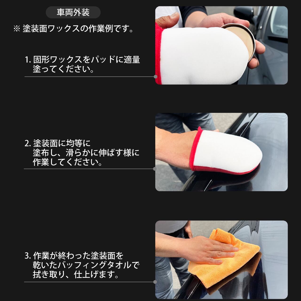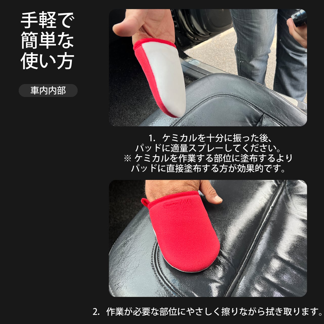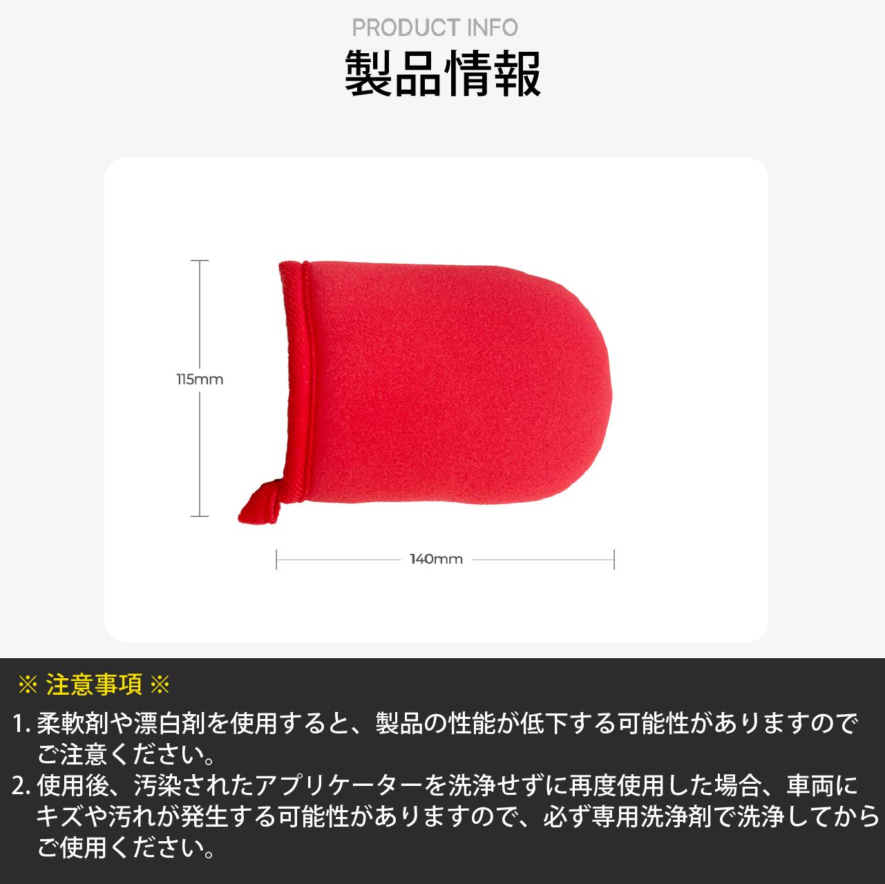 2.使用後、汚染されたアプリケーターを洗浄せずに再度使用した場合、車両に傷や汚れが発生する可能性がありますので、必ず専用洗浄剤で洗浄してからご使用ください。